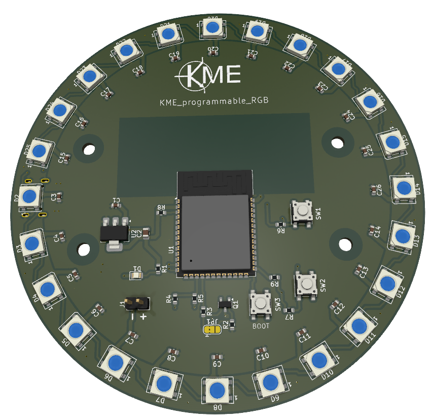 Jedná se o programovatelné RGB kolečko, které jde připojit k WIFI, Bluetooth a také USB C kabelem k externímu zařízení (PC). Používá mikrokontrolér ESP32 a LED WS2812B.