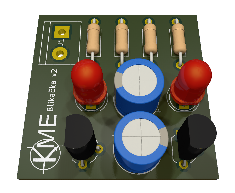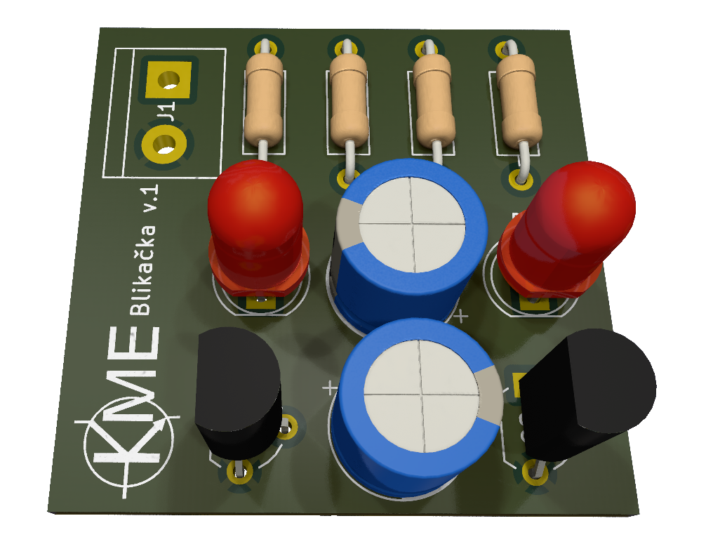 Tato konstrukce blikačky se střı́davě se rozsvěcujı́cı́mi LED je již tradičnı́ úvodnı́ konstrukce na KME. Jedná se o klasické zapojenı́ tranzistorového astabilnı́ho klopného obvodu.