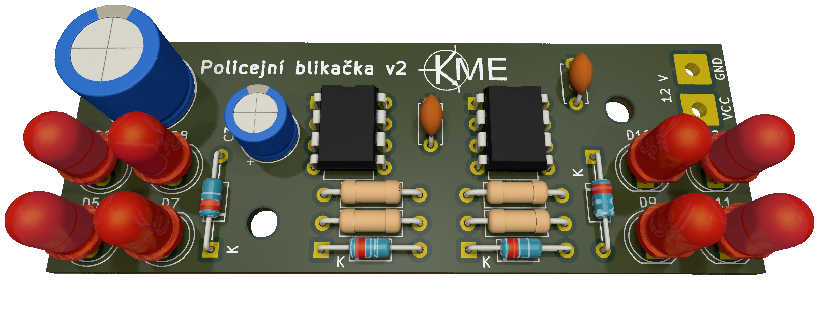 Jedná se o policejní blikačku, která po zprovoznění vytváří efekt podobný policejnímu majáku. Funguje na bázi dvou integrovaných obvodů NE555 ( a ), které jsou zapojeny jako astabilní multivibrátory (oscilátory) s různými frekvencemi, aby vytvářely efekt rychlého blikání střídaného v pravidelných intervalech.