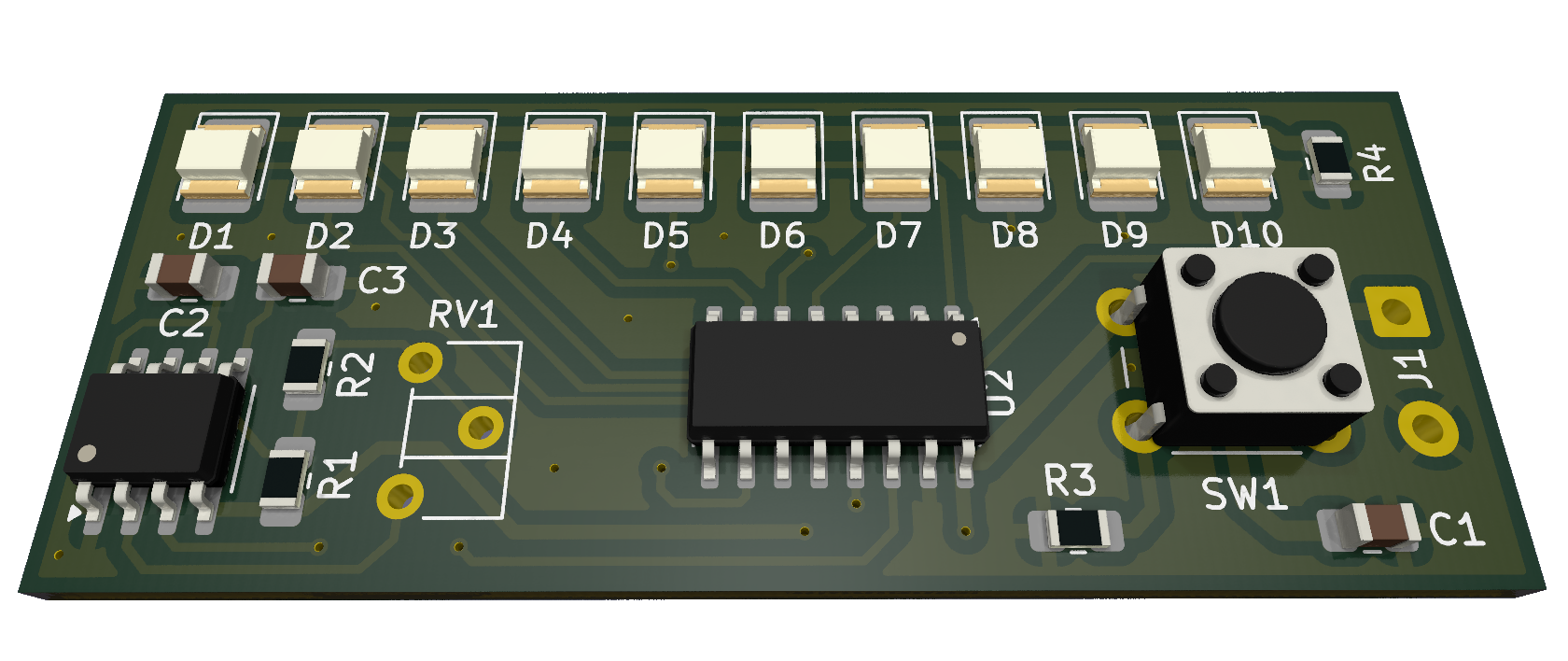 Tento projekt je SMD verze projektu běžící světlo s přidaným spínačem pro zastavení čítače. Toto tlačítko umožňunuje "běžící světlo" zastavit.