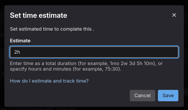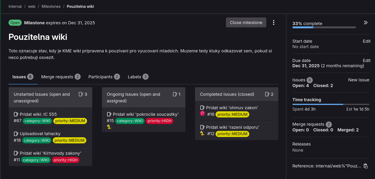 GitLab umožňuje poměrně použitelně sledovat čas na projektu. Tuto funkci na KME běžně nepoužíváme, ale u větších projektů může být velmi užitečná. Velkou výhodou logování času je přehled nad vývojem projektu, především v kombinaci s využitím milestonu.